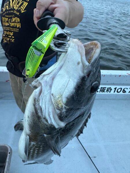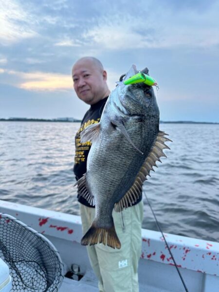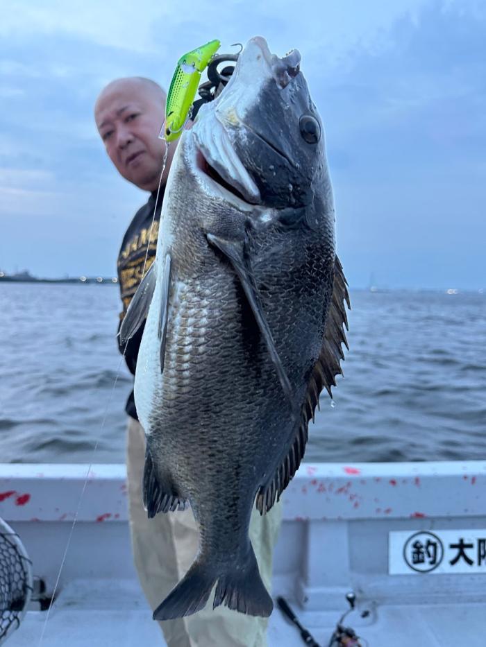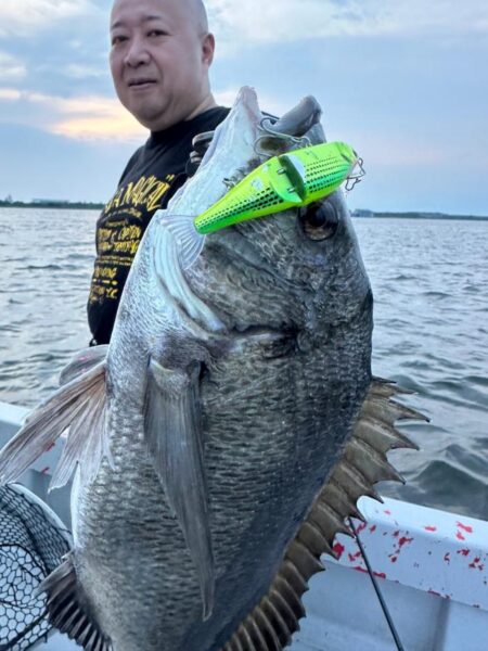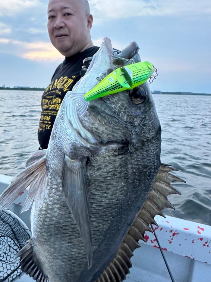 日暮れから出船! 明るい時間はチヌトップからスタート!普通に釣っても面白くないので小さめのビッグベイトで! これがまた反応よくて良いコース通れば一撃でナイスサイズのクロダイヒットでした!